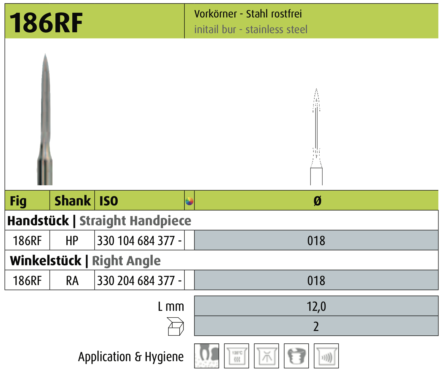 Фреза хірургічна Jota 186RF.104.018 — це спеціалізований пілотний різець (Vorkörner), призначений для хірургічних робіт. Цей інструмент виготовлений з високоякісної нержавіючої сталі