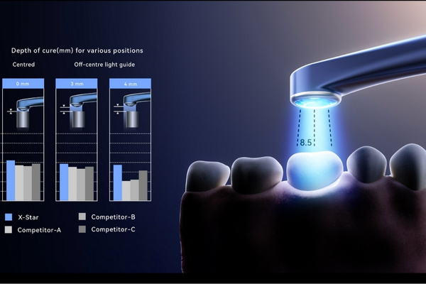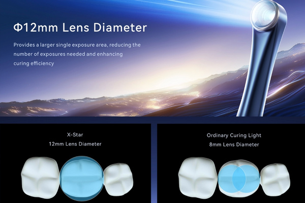 На відстані опромінення 10 мм кут світла становить лише 8,5∘, що забезпечує більш концентрований потік і глибшу полімеризацію. Завдяки більшому діаметру лінзи, рівномірному світловому потоку та винятковій проникній здатності, X-Star гарантує надійну роботу навіть у складних сценаріях позиціонування світла.