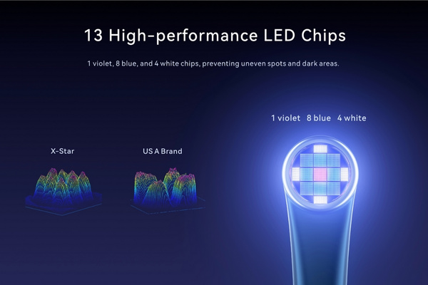 Лампа оснащена 13 високопродуктивними світлодіодами (1 фіолетовий, 8 синіх і 4 білих), які гарантують абсолютно рівномірну полімеризацію без темних плям чи незасвічених зон.
