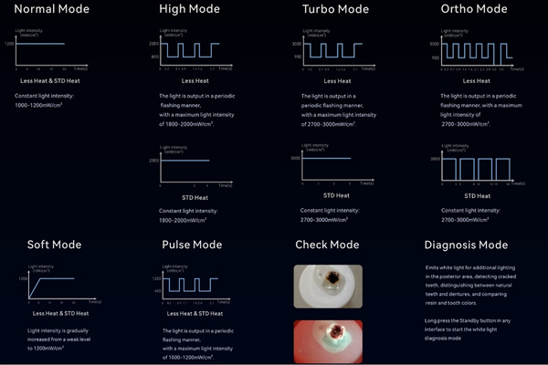 - У режимі перевірки або діагностики може використовуватися для таких операцій, як виявлення карієсу або додаткове освітлення