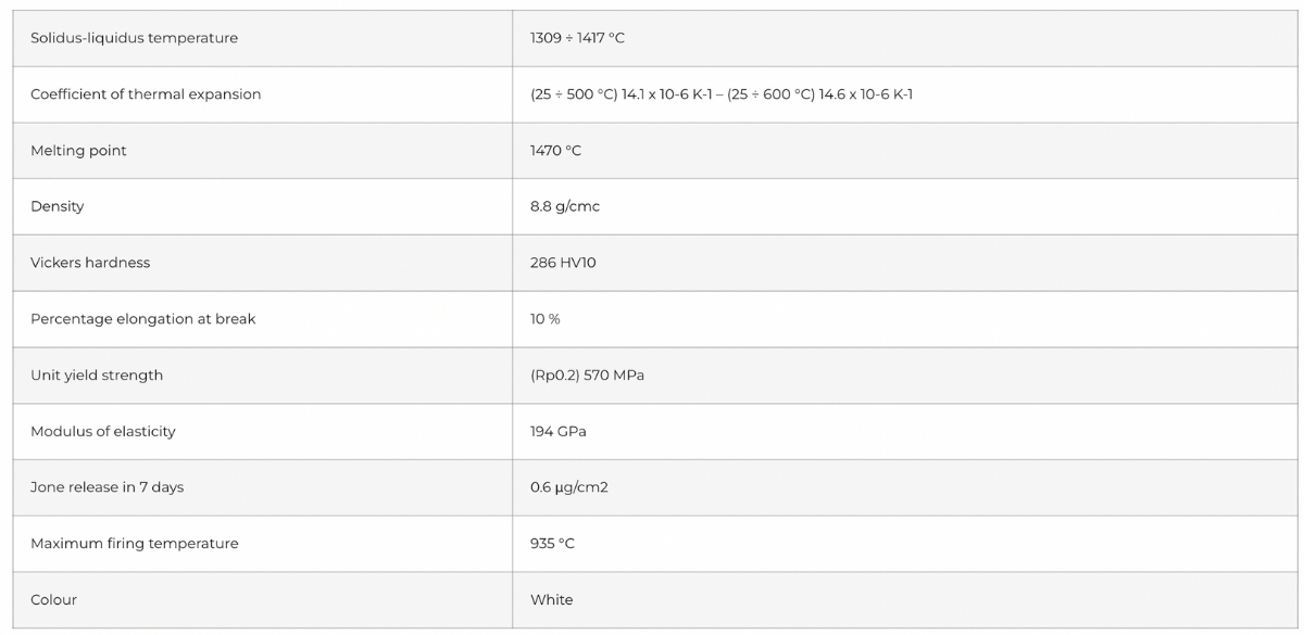 Завдяки цьому складу, матеріал має відмінну оброблюваність, високу біосумісність та стійкість до корозії. Важливо відзначити, що сплав не містить нікелю, кадмію та берилію і має низьку питому вагу. Готовий виріб має білий колір.
