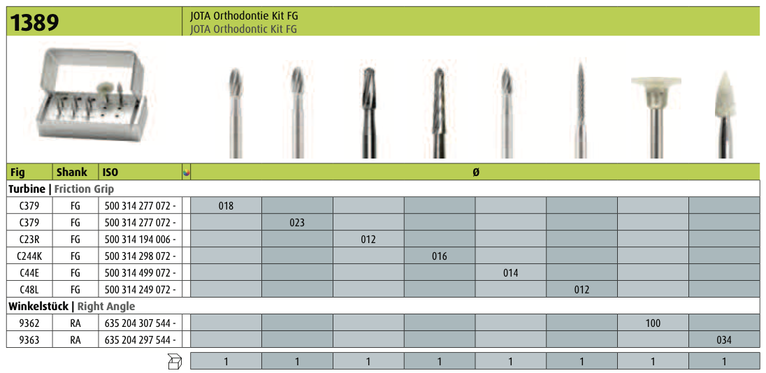Набір Jota ORTHODONTIC KIT FG (Артикул: 1389) – це професійно підібраний комплект інструментів, створений спеціально для фінального етапу ортодонтичного лікування – безпечного та ефективного видалення залишків адгезиву (клею) з поверхні емалі після зняття брекетів. Розроблений у співпраці з практикуючими ортодонтами, цей набір пройшов клінічні випробування та гарантує прогнозований результат.