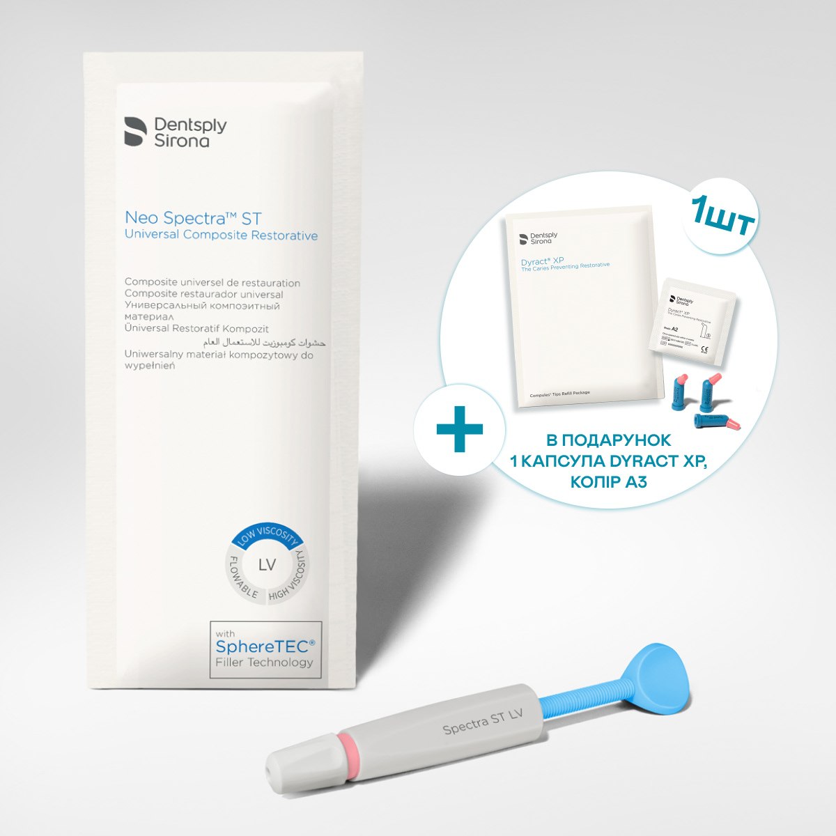 Лінійка композитів Neo Spectra™ ST – це сімейство нових композитних матеріалів Neo Spectra™ ST (LV – низька в'язкість та HV – висока в'язкість), Neo Spectra™ ST Effects та Neo Spectra™ ST flow від Dentsply Sirona із запатентованою технологією наповнювача SphereTEC®.