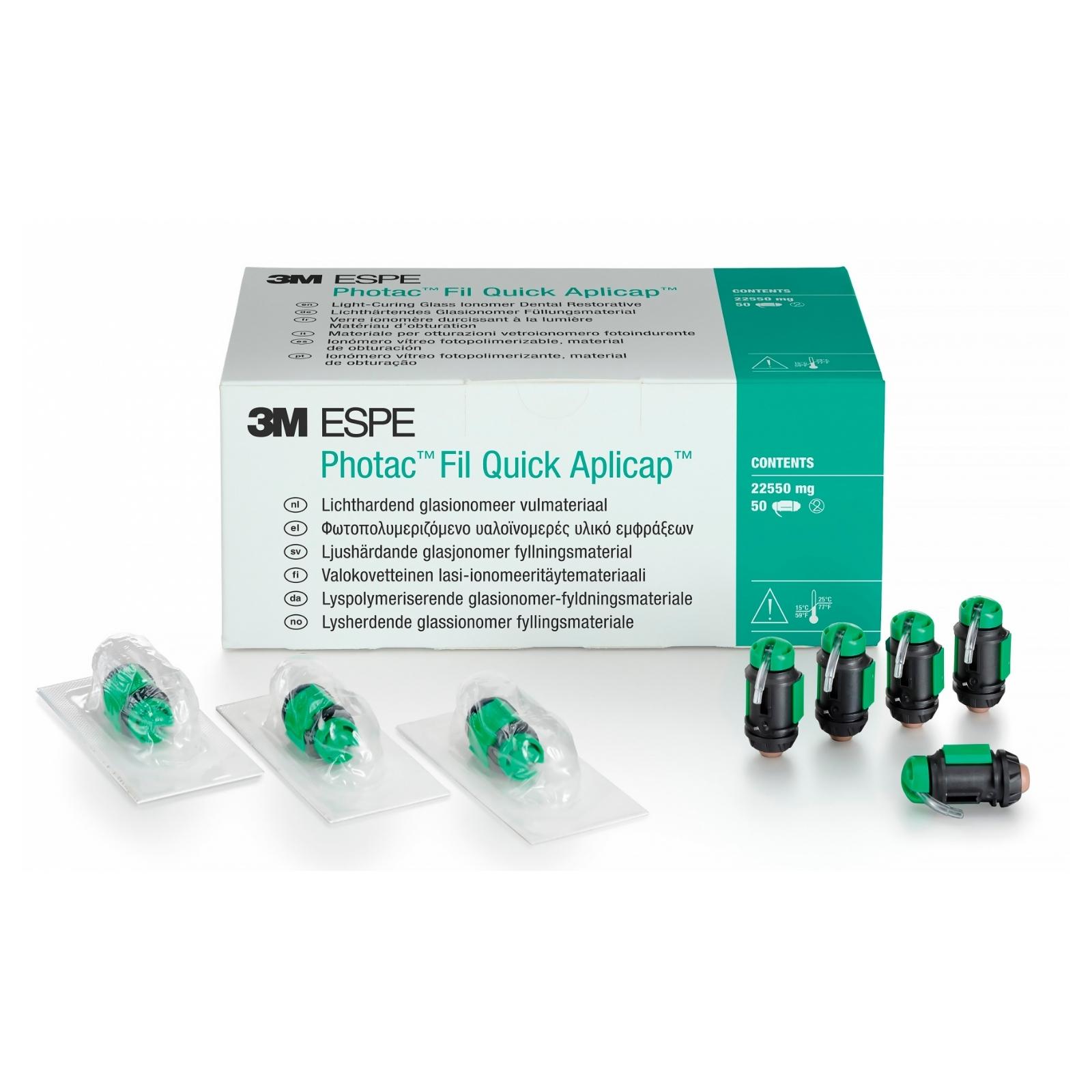 Photac Fil Quick Aplicap - унікальний склоіономерний матеріал для постійного пломбування отверждаемый світлом випускається відомим виробником 3M Espe. Застосовується в терапевтичній стоматології при проведенні відновлення (тимчасового чи постійного) молочних, жувальних та передніх зубів. Реставраційний цемент має пастоподібну структуру та однокомпонентний склад, що упаковується в невеликі одноразові капсули об'ємом 0,13 мл.