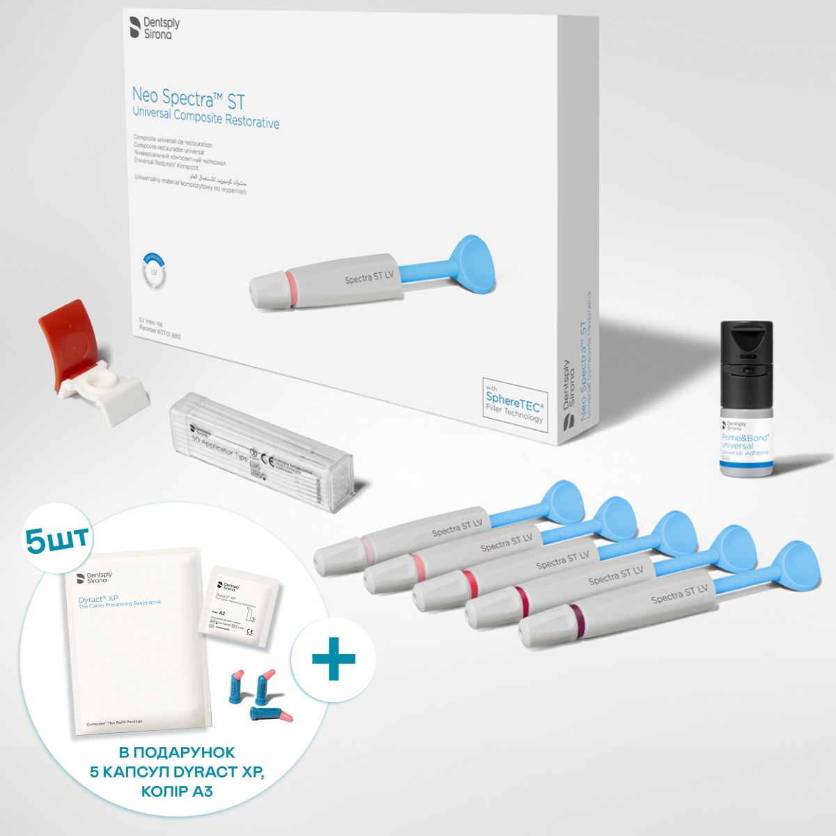 Лінійка композитів Neo Spectra™ ST – це сімейство нових композитних матеріалів Neo Spectra™ ST (LV – низька в'язкість та HV – висока в'язкість), Neo Spectra™ ST Effects та Neo Spectra™ ST flow від Dentsply Sirona із запатентованою технологією наповнювача SphereTEC®.