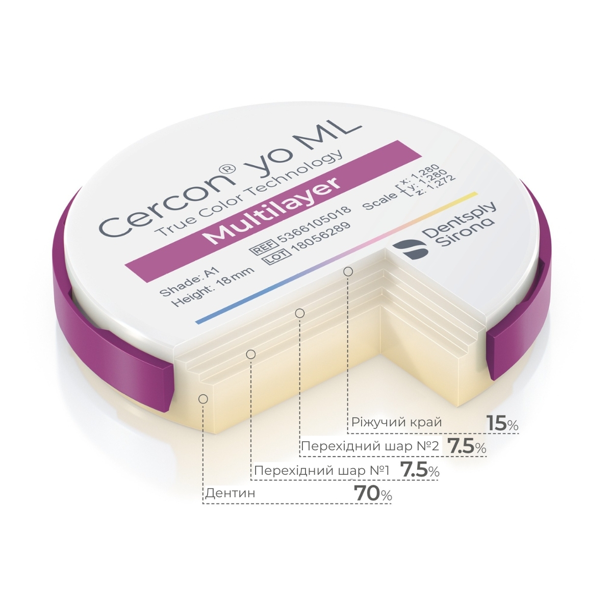 Cercon® YO ML — це інноваційний багатошаровий цирконієвий диск з оптимізованим вмістом ітрію (Hybrid 4Y/5Y), який поєднує високу естетику та підвищену міцність для широкого спектра клінічних випадків.