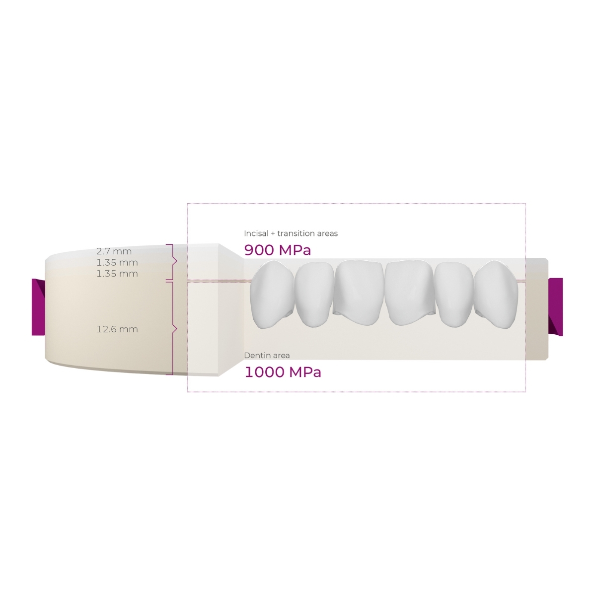 Матеріал має подвійну зону різцевого краю та на 20% вищу міцність у різцевій ділянці порівняно з Cercon HT ML, що забезпечує стабільні результати як у фронтальній, так і в бічній зонах. Завдяки природному градієнту прозорості та технології True Color Technology, диск демонструє точну відповідність VITA Shade Guide, що підтверджено сліпими тестами в США та Європі.
