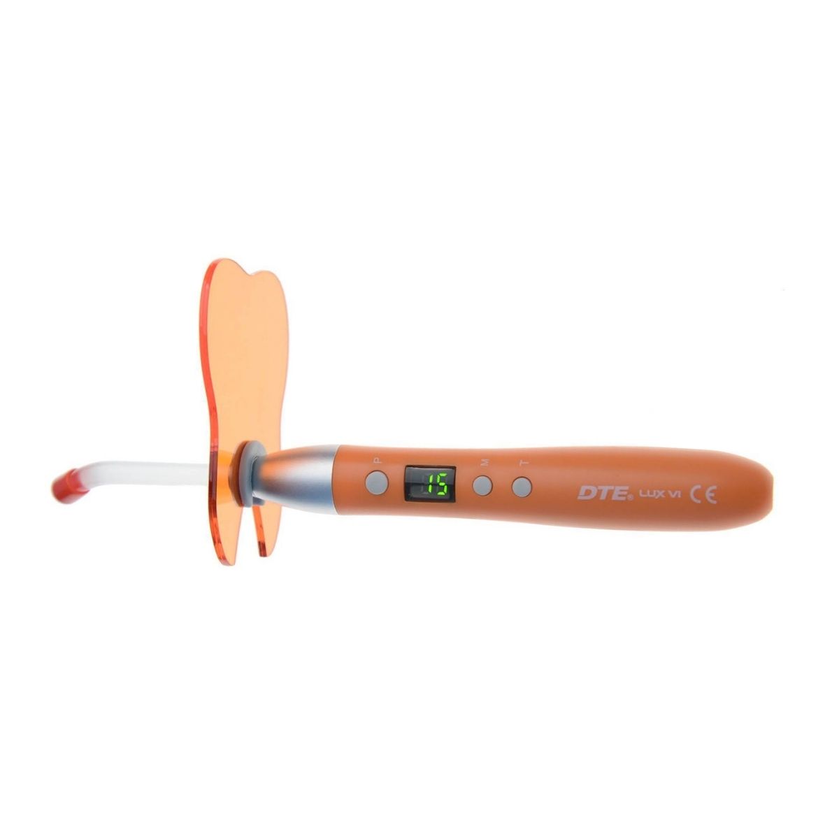 Лампа фотополімерна Lux VI, помаранчевого кольору (можливість роботи безпосередньо від адаптера живлення). 3 режими роботи: повний старт, імпульсний, м'який старт. 385 – 515 nm. Потужність: 1000-1700 mW/cm. Час експозиції: 5 сек, 10 сек, 15 сек, 20 сек. Можливість живлення від мережі. Вага 100 грам