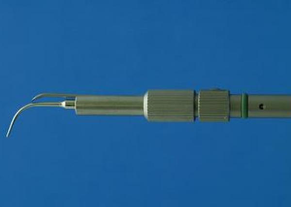 Вставка 25K, P-100 (FUR) Slim (02KK), к магнетоскалеру 25 Khz, тонкая, для чуствительных участков, с внешней металической трубкой подачи жидкости, металическая ручка. Рабочий диапазон мощности скалера: от низкой к средней. Совместима с системой CAVITRON