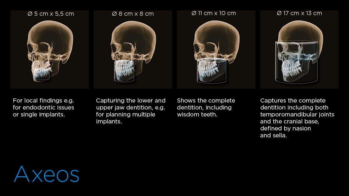 Axeos – спеціалізована система 2D/3D з великим об'ємом і високою якістю зображення для клінік, що пропонують широкий спектр послуг. Розроблена спільно з стоматологами та клініками, Axeos забезпечує найповніший набір функцій серед усіх рентгенівських апаратів Dentsply Sirona.