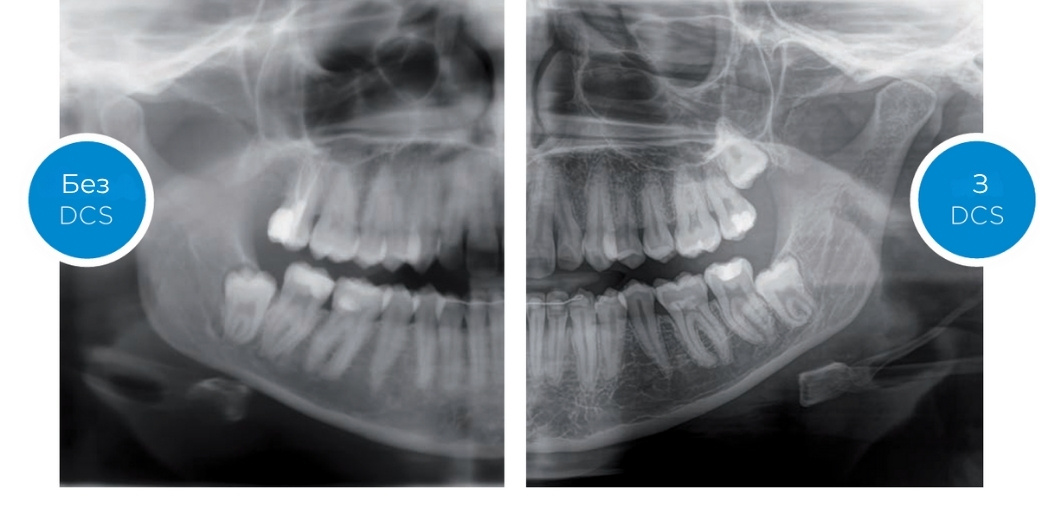 На зображенні нижче показано панорамний рентгенівський знімок без технології DCS та з нею.